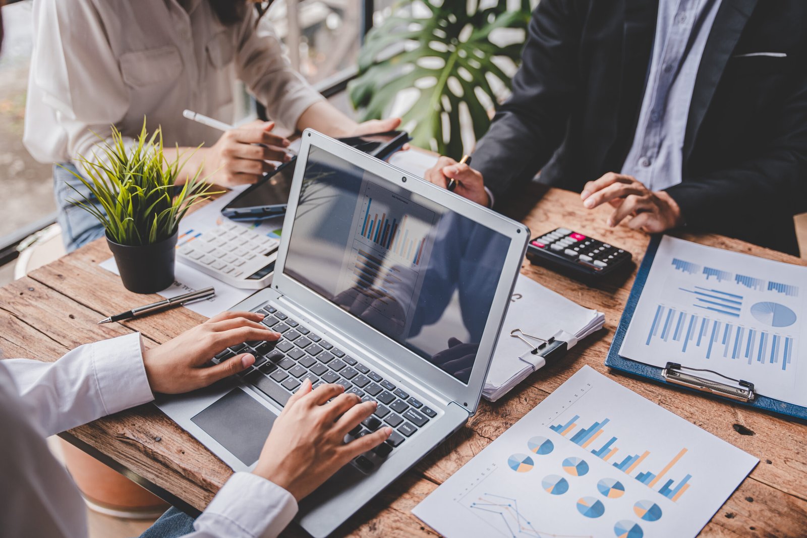 Business team analyzing income charts and graphs with modern laptop computer. Close up